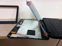 • Remove 2 screws at bottom of LCD frame and also the 2 screws at top of LCD frame (not pictured). This will allow you to lay the back cover away from frame to access side easier and remove the 3 screws on each side to detach LCD screen. Do not pull LCD once unscrewed, lay down face down on keyboard for last step.